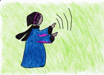 Consultando il volume, infatti, trovarono dopo poco, l’indirizzo del losco figuro e si recarono verso la sua casa. Quando comparve sulla soglia di casa, incuteva davvero timore...era alto e tutto coperto da una lunga veste viola che gli copriva anche il viso.
